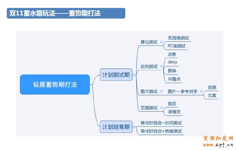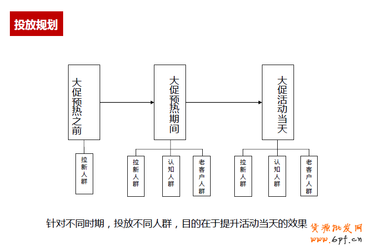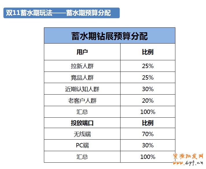 接著來看看整個蓄水期中預算方面的布局。隨著時間越來越接近雙11,預算也應該相應的遞增。針對不同人群,預算也應該有相應的分配,圖中是根據(jù)以往的安排和測試的數(shù)據(jù)得出大致的安排,供大家參考。