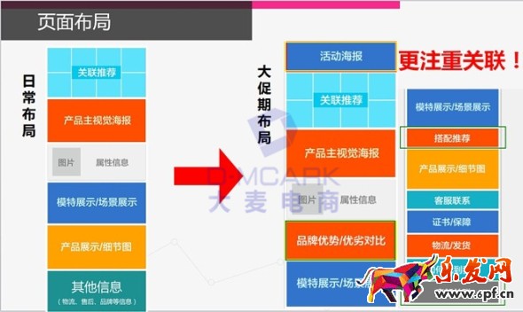 大促期間,全店流量都會有一個比較大的提升,我們要思考是如何將每一個流量發揮到最大作用。下圖是筆者根據以往年大促時的頁面優化經驗所得。我們可以看到大促期間非常注意活動信息的展現(活動海報、優惠券等)和關聯銷售,在頁面的頂部、中部和底部都有不同形式的關聯銷售,每一部分應該放什么產品類型的關聯,我將會在下面繼續講解。