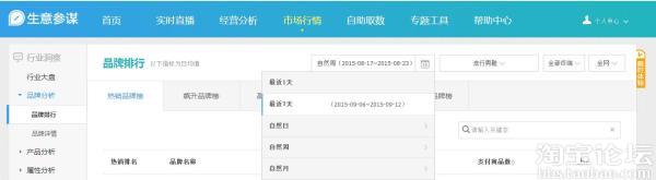 首先,市場行情大部分地方的數(shù)據(jù)在時(shí)間段選擇上提供:1天 7天 自然日 自然周 自然月 自定義時(shí)間;在平臺(tái)上分為淘寶、天貓和全網(wǎng);終端上分PC端、無線端和全部終端。也就是說,市場行情提供了目前為止最全面的無線行業(yè)數(shù)據(jù)。市場行情絕大部分地方提供三年的行業(yè)數(shù)據(jù)供分析參考