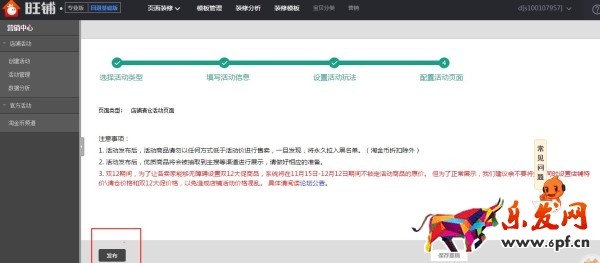 第七步:發布創建的活動,活動將在指定時間內生效,設置的商品將由系統打上“淘清倉”標簽的折扣價格,活動一旦設置生效,淘清倉價格標簽將生效至活動結束期,旺鋪后臺取消活動的創建,淘清倉價格標不會失效,請知曉。