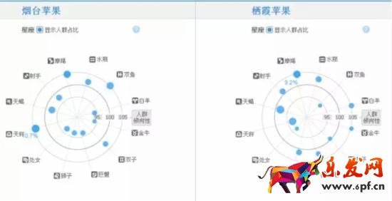 “人群傾向性”反映不同人群對該詞的偏好程度,數(shù)值越大偏好程度越高,數(shù)值為100時,表示無傾向性。在這里,我們只看“外圈”的星座,并簡單的分析。