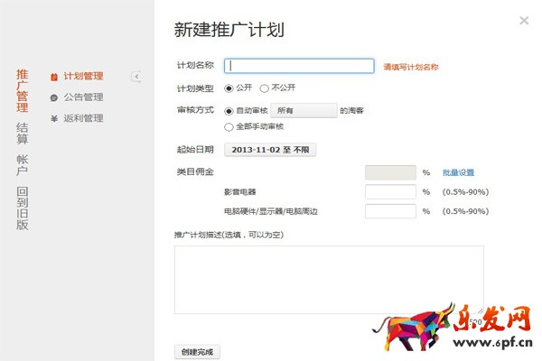 四、填寫(xiě)新建推廣計(jì)劃的資料,如:名稱、類型、審核方式、起始日期、傭金、描述。