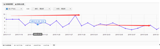 上面的兩張圖分別是投產(chǎn)趨勢(shì)和轉(zhuǎn)化率趨勢(shì),從中可以看到11月份和12月份明顯的變化。根據(jù)以往的經(jīng)驗(yàn)得出,如果直通車(chē)的轉(zhuǎn)化率一直按照這個(gè)趨勢(shì)發(fā)展的話,投產(chǎn)會(huì)越來(lái)越差,質(zhì)量分也會(huì)隨著下滑,導(dǎo)致花費(fèi)增加。這時(shí)候該怎么辦呢?