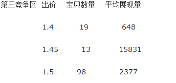 出價0.6的時候 206個寶貝 平均展現(xiàn)189 按照總展現(xiàn)量計算 38934。例如一個優(yōu)質(zhì)寶貝詞占3W的展現(xiàn)了 剩下的8000多個展現(xiàn)分給剩下的205個寶貝 一個展現(xiàn)30多個 這一算還真的比較符合事實,不信各位掌柜可以看看直通車后臺,那問題來了,都200多個寶貝跑過去沒水喝啦 ,你準備一個新寶貝也去展現(xiàn)40個嘛。 所以 這就是為什么先看好1.4——1.45區(qū)間 2——2.15的區(qū)間考慮, 那你這同樣還是面臨被優(yōu)質(zhì)寶貝排擠的威脅啊,記住 優(yōu)質(zhì)寶貝會在獲取足夠的流量空間的低價土壤下生長,或者在往上擴張,擴大市場占有率,出高價。 對于中間價位展現(xiàn)居中寶貝量少的才是新寶貝的首選。 至于精準的出價多少希望各位親自己測試計算,價格是浮動的因為你今天出價1.4 那你昨天出價的1的位置就會減少,同樣出價1.4的人也會增多,關(guān)注好實時數(shù)據(jù),按照區(qū)間價位從第三寶貝競爭區(qū)域向第一寶貝競爭區(qū)域靠攏。