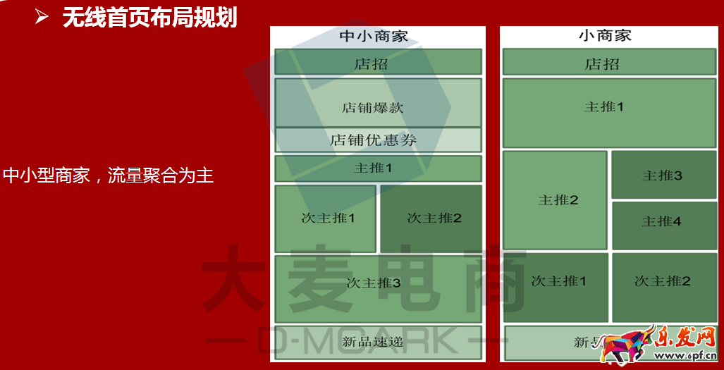 建議在無線端的首頁裝修中,可以多用自定義裝修模板。自己去設計符合店鋪的分類結構,模塊也要清晰明了。切忌模塊沒有界限,分不清,全部是寶貝的情況。無線端的裝修更應該是活動+寶貝的排列模式。