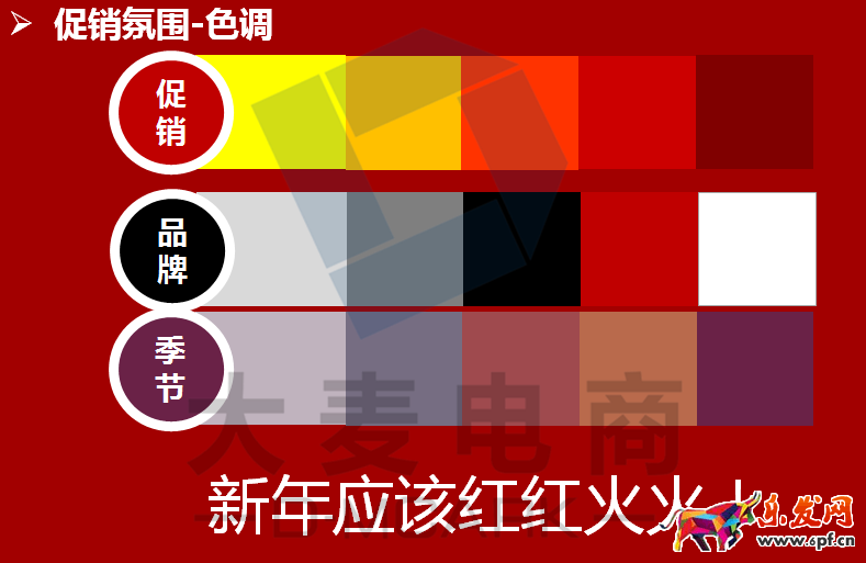 一般而言,促銷的色彩都是明度很高的,亮眼的顏色,而春節的需求則更加簡單,直接以鮮艷的紅色系色調,呈現紅紅火火的整體感覺。