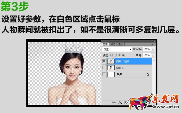 三、如下圖,隱藏背景和圖層1(勾走圖層前的“眼睛”),然后檫掉白色區域,大面積就一筆檫掉,小面積就一點一點檫掉,細活就慢慢來,人物很快就摳出來。