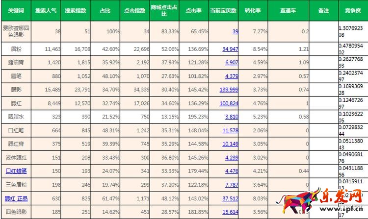 結合店鋪目前的引流詞,我們可以發現上圖中“豬油膏”這個詞相對來說,搜索人氣比較高,轉化率在4.59%。當前的競爭寶貝才6907,而“眉粉”的競爭寶貝數已經是它的5倍左右,競爭度的取值權重很優秀,店鋪在初期階段,為了引流的短暫積累,可以重點考慮。