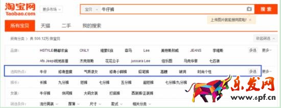 另一個例子就是自然搜索,下圖的搜索欄中輸入牛仔褲,從藍框看到選購熱點有很多種關鍵詞提供給賣家參考。
