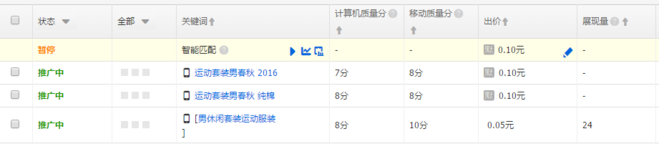 3、培養到10分之后我們就可以把這3個長尾詞刪除了。然后我們可以加我們需要推廣的大詞進去。建議大家不要一下子就加最大的詞可以先加:運動套裝男春秋、運動套裝男開衫等3級詞然后再加 運動套裝男。然后就是運動套裝、運動服等大詞進去!