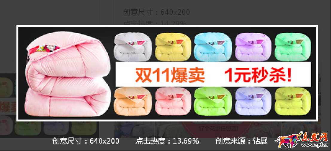 這張圖雖然丑,但是在雙11預(yù)熱前測試時點擊率和產(chǎn)值都很不錯,大促前,也測試換成了平鋪的被子圖片,但是效果一般。所以選用“疊拍”方式,讓產(chǎn)品質(zhì)感突出。在雙11時候直接把原來強調(diào)銷量的文案改成“1元秒殺”,讓點擊率飚至13%以上,成為了雙11無線首焦流量核心貢獻者。當(dāng)然這個要和落地頁相互對應(yīng)。
