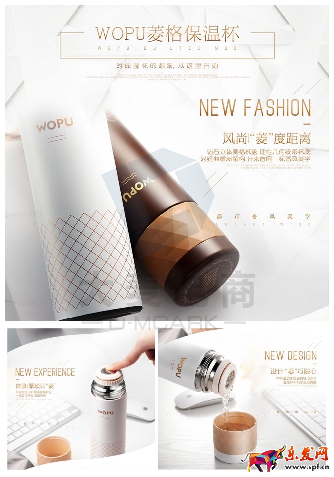 將產品賣點進行文案的提煉,統一出能貫穿所有賣點的關鍵字,再進行潤色處理,如下圖將產品的賣點“風尚‘菱’度距離”、”體驗繁瑣歸‘菱’“、”設計‘菱’巧貼心“,很好地將杯型的菱格與每個賣點進行文案的結合,巧妙且恰到好處。