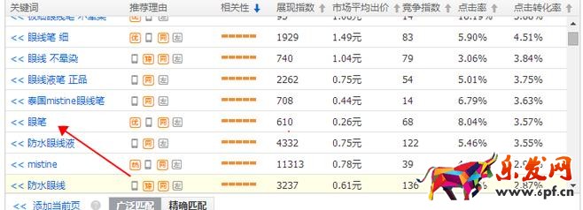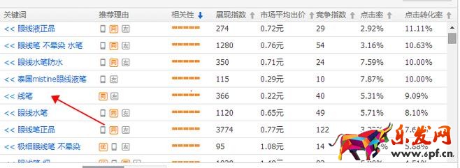那么在我們添加詞的時(shí)候,點(diǎn)擊一下轉(zhuǎn)化率。那么把所有有轉(zhuǎn)化的詞添加進(jìn)去,有多少就添加多少。那么如果轉(zhuǎn)化低詞大于200個(gè)怎么笨呢?你添加的時(shí)候看著,不相關(guān)的詞不要添加進(jìn)去。那么詞添加完了之后什么折扣亂七八糟都按照上面(1)來(lái)。這時(shí)候你的直通車(chē)是暫停的狀態(tài),不要打開(kāi)。然后我們來(lái)篩選一下關(guān)鍵詞。不沾邊和類目詞直接刪除,假如我是彩妝眼線筆,請(qǐng)看下圖。