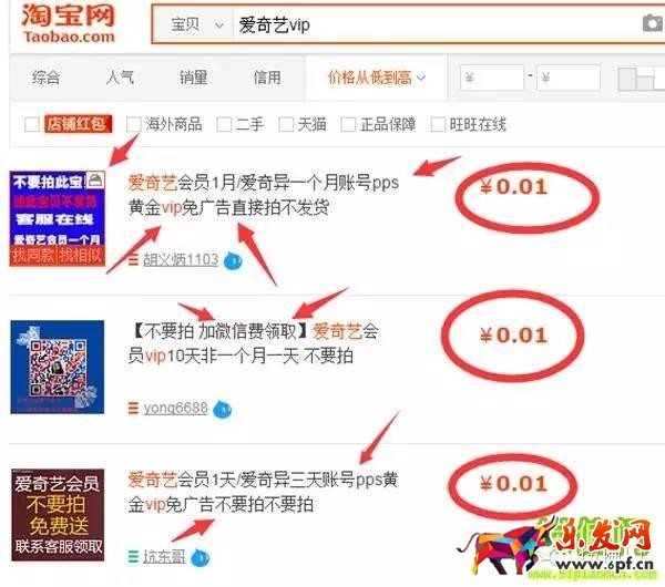當(dāng)然,你肯定是競(jìng)爭(zhēng)不過這些大店鋪的。有人會(huì)問:憑什么你發(fā)布商品就會(huì)有好的排名?這個(gè)問題問的好。這不是很多排名規(guī)則嗎?很多買愛奇藝會(huì)員的會(huì)想著買最便宜的,那不是有個(gè)價(jià)格從低向高排嘛。我再給你搜一遍,竟然有0.1元的,而且只送不賣的,現(xiàn)在愛奇藝vip會(huì)員引流真是一招更比一招狠啊。這根本不是來淘寶做生意的,這是來淘寶搶流量的。他們送你會(huì)員干嘛?讓你加他好友或者微信或者加群啊。想想一大波小白火急火燎的來搶這個(gè)免費(fèi)的vip,我就一個(gè)字,服。