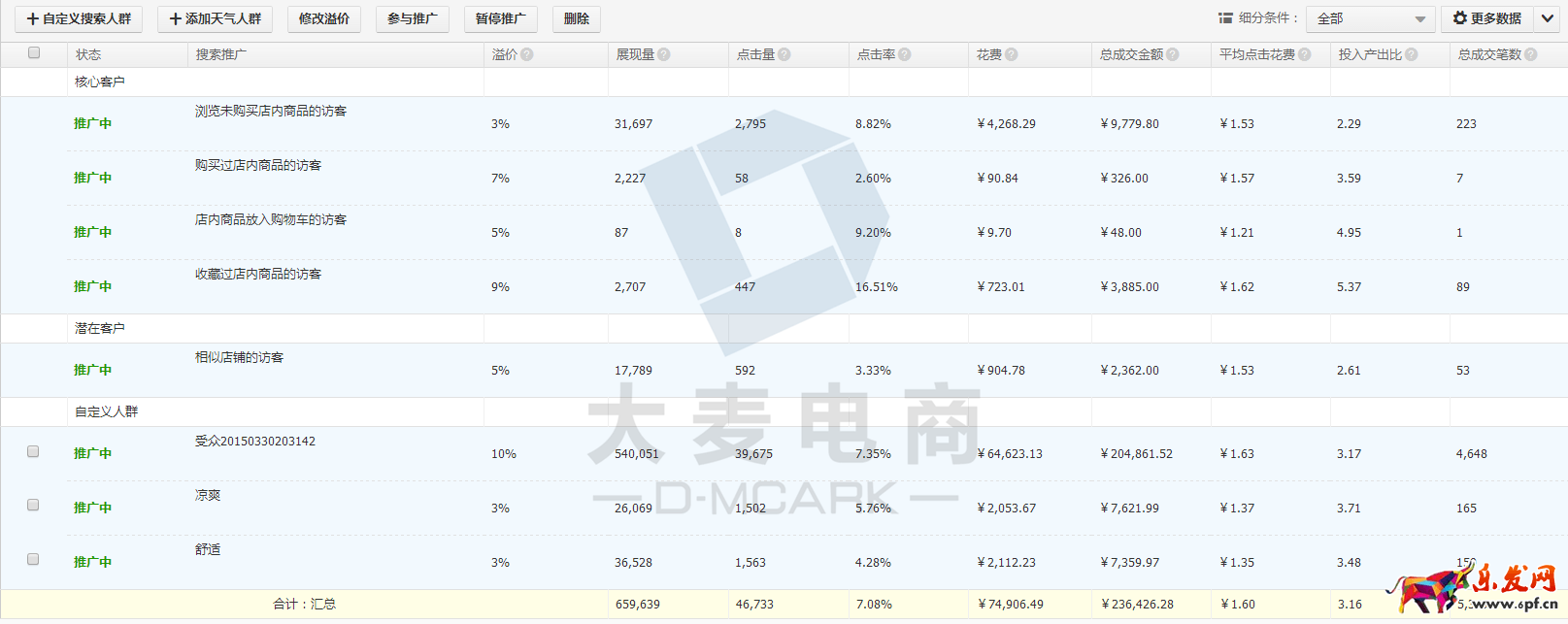 針對搜索人群這塊,收藏過店內(nèi)商品的訪客,店內(nèi)商品放入購物車的訪客這些可以適當(dāng)加大溢價,觀察轉(zhuǎn)化的表現(xiàn),數(shù)據(jù)好的話可以慢慢適當(dāng)加大些。在自定義人群這塊,根據(jù)產(chǎn)品的屬性指數(shù)去自定義的去選擇投放的維度。篩選出好的重點培養(yǎng)。如圖所示,這塊對轉(zhuǎn)化還是很理想的。