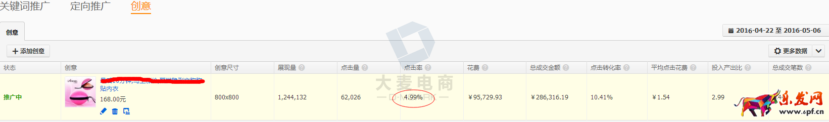 在直通車推廣初期,針對點擊率低的這個問題,我們嘗試切換不同的推廣圖去測試一段時間。同時,對直通車拉低寶貝點擊率的關(guān)鍵詞有針對性的去調(diào)整,對關(guān)鍵詞這塊定時的去篩選,同時監(jiān)控點擊率的變化,篩選出合適的創(chuàng)意圖。如圖所示,點擊率從推廣前0.72一致上升到4.99%。質(zhì)量得分得到很好的培養(yǎng),為后期爆發(fā)做好了基礎(chǔ)。