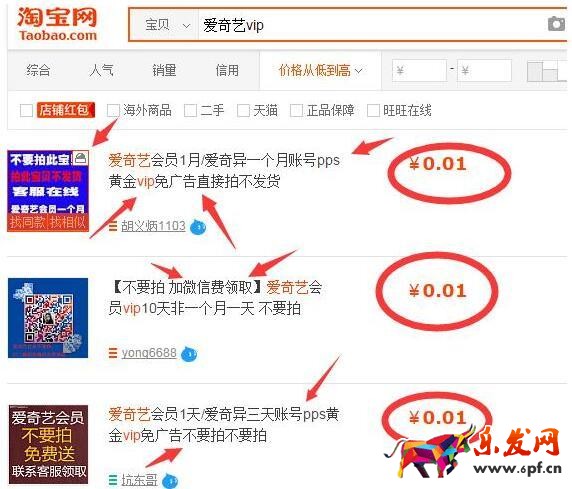大家知道,想買到最便宜的愛奇藝VIP就只能上淘寶購買了,我們點擊價格從高到低的排序,如下圖所示:
