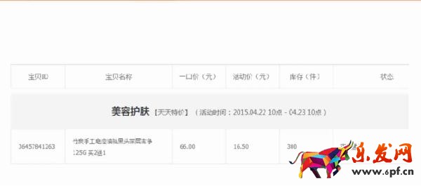 第一:在你申請天天特價的通過審核之后就會出現圖下的頁面,里面顯示了你申請的寶貝的ID、寶貝名稱、一口價、活動價以及庫存和活動時間。(以美容護膚為例)