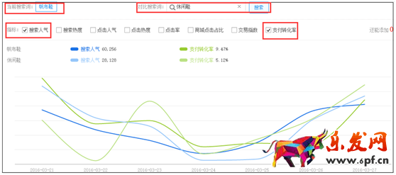 好處是,你可以一下子比較兩個詞。在生意參謀——市場行情——搜索詞查詢,還是看7天的數據就差不多,基本可以簡單的判斷一下確實。當然,為了嚴謹,你可以看更多的數據,只不過一次只能看兩個數據。我們的建議就是看搜索人氣和支付轉化率的數據。