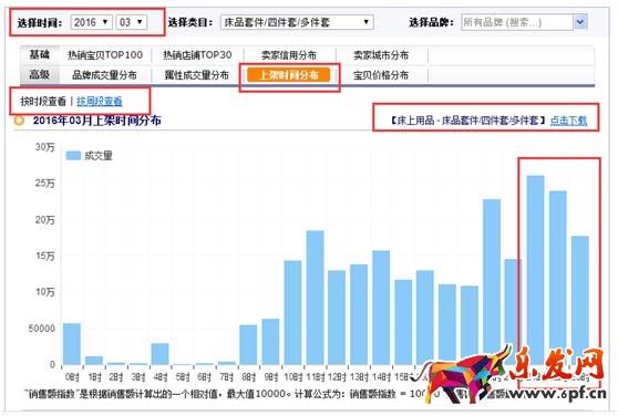 我擦,這玩意兒還要配合!當(dāng)然需要,說過很多次,店鋪?zhàn)龅暮貌缓茫鋵?shí)都是一個(gè)又一個(gè)的細(xì)節(jié)堆積到一起的,這一點(diǎn)我做到了,你沒有做,至少在這個(gè)得分上,我就取得了領(lǐng)先。。我們假設(shè)一下,你準(zhǔn)備重點(diǎn)優(yōu)化的關(guān)鍵詞,根據(jù)店鋪的實(shí)際情況,準(zhǔn)備是:長(zhǎng)袖連衣裙。路徑:生e經(jīng)——行業(yè)分析——我的情報(bào)——情報(bào)助手——選擇好類目——寶貝按人氣前200排序——填好關(guān)鍵字——選擇好你準(zhǔn)備競(jìng)爭(zhēng)的價(jià)格區(qū)間——點(diǎn)擊上架時(shí)間分布,看下圖:哎呀,我去!這數(shù)據(jù)太牛逼了吧!是的,太牛逼了!(注:截圖都是截了一半兒,不完全,然后數(shù)據(jù)可以下載!)