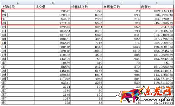 我們把數(shù)據(jù)下載下來,然后計(jì)算一下每個(gè)時(shí)間段的競(jìng)爭(zhēng)力(計(jì)算公式為:競(jìng)爭(zhēng)力=成交量/高質(zhì)寶貝數(shù),表示的是平均每個(gè)高質(zhì)寶貝可以分到的成交量,這個(gè)數(shù)值越小,表示競(jìng)爭(zhēng)越激烈,反之競(jìng)爭(zhēng)越不激烈)。你有沒有發(fā)現(xiàn):早晨4點(diǎn)——5點(diǎn)這個(gè)時(shí)間段竟然是競(jìng)爭(zhēng)力最大的時(shí)間段,那么是不是所有的都應(yīng)該選擇這個(gè)時(shí)間段了呢?依然不是,因?yàn)檫€要考慮店鋪的實(shí)際情況。這個(gè)我們后面會(huì)說到。現(xiàn)在跟以前不一樣了,因?yàn)闊o線端的發(fā)展,一天24小時(shí),幾乎沒有特別明顯的界限在什么時(shí)間段是完全的沒有銷量了!但是,賣家要休息啊!所以更多的賣家還是會(huì)在白天的時(shí)候安排寶貝下架!是不是有機(jī)會(huì),自己想!