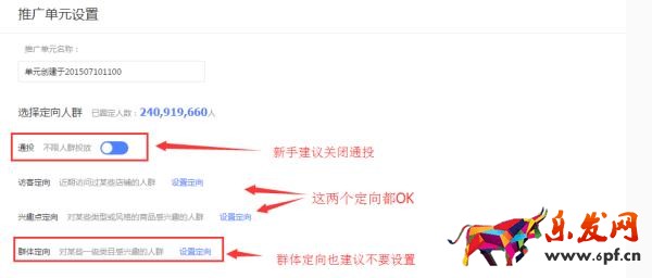 ①填寫(xiě)推廣單元名稱(chēng)、選擇定向:定向都是自主可選,不是每個(gè)定向都必須要設(shè)置!新手建議先關(guān)閉通投、群體,先設(shè)置最為精準(zhǔn)的訪(fǎng)客定向。