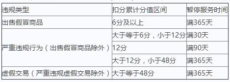 二十五 用戶因違反《淘寶規則》、《天貓規則》或《阿里旅行規則》被處罰的,阿里媽媽除采取本規范第二十三條規定的措施外,同時有權依違規類型與扣分累計分值區間,按下表所列時間中止用戶的鉆石展位服務: