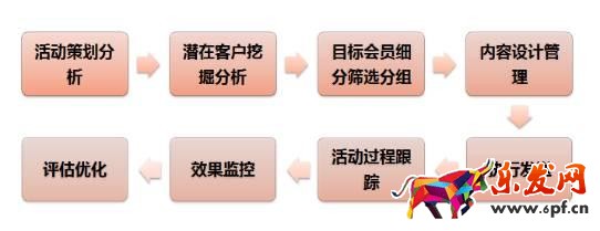 營銷的步驟我們可以把它拆解為下面九步來走:活動整體策劃——活動分析——潛在客戶分析——目標會員篩選分組——內容管理設計(主題頁面、banner廣告、短信、郵件等傳遞內容設計)——執行發送——活動跟進——效果監控——評估優化。如圖所示
