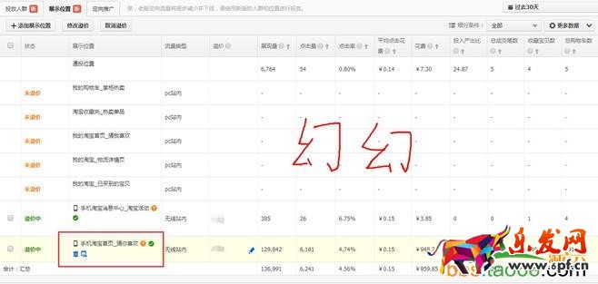 對于展示位置,可能很多人還很陌生,因為我的直通車一開始就是放棄PC流量的,所以對于PC端口展示位置,我沒有做出溢價,而是針對無線端的兩個位置做出了溢價,溢價規則同上,對于上圖框起來的位置,應該是比較優質的,建議可以適當增加溢價比例。