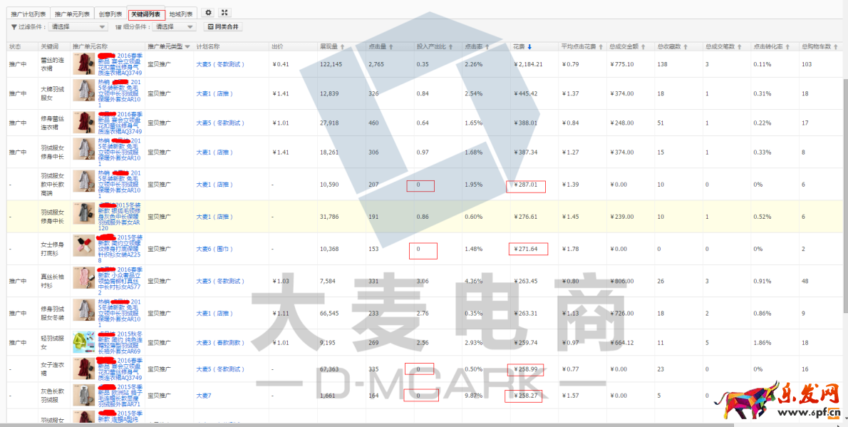 進(jìn)直通車報(bào)表,第一我們要減低沒(méi)用的花費(fèi),時(shí)間選30天,如圖畫(huà)紅色的,花費(fèi)相對(duì)來(lái)說(shuō)比較高。但30天都沒(méi)投產(chǎn),這時(shí)我們就可以把這些花費(fèi)減低,分擔(dān)到其他有投產(chǎn)的關(guān)鍵詞,這樣可以減低我們直通車這些沒(méi)用的花費(fèi),把直通車花費(fèi)最有效利用。