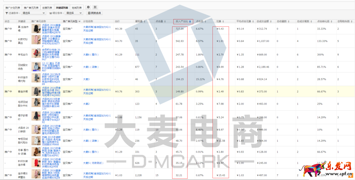 第二,我們要增加有成交的關(guān)鍵詞,從而增加成交金額,進(jìn)而增加投產(chǎn),按頭產(chǎn)排,如圖紅色圈著的,投產(chǎn)高,而花費(fèi)比較少,這樣我們就可以增加這些關(guān)鍵詞的出價(jià),讓它們產(chǎn)生更高的投產(chǎn)。這只是針對(duì)大部分店鋪是這樣調(diào)的,但有些基礎(chǔ)較差的店鋪,比如說(shuō)直通車根本就沒(méi)投產(chǎn),花費(fèi)也不高,這也有可能是推廣圖問(wèn)題,在把我們店鋪基本功優(yōu)化好后,這樣的店鋪我們前期一定要讓直通車產(chǎn)生數(shù)據(jù),找一下比較精準(zhǔn)的詞,這些詞出價(jià)會(huì)比較低,先讓關(guān)鍵詞產(chǎn)生數(shù)據(jù),然后再根據(jù)上面的調(diào)發(fā)進(jìn)行優(yōu)化,從而帶動(dòng)店鋪流量投產(chǎn)。