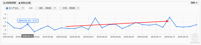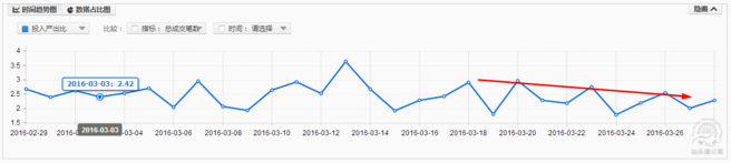 分析:從半個月數據來看,在這段時間內,通過優化創意提升點擊率,根據轉化情況控制渠道力度,使流量有所上升,PPC有明顯的逐步下降趨勢,直通車ROI數據也在波動中有小幅上升趨勢。