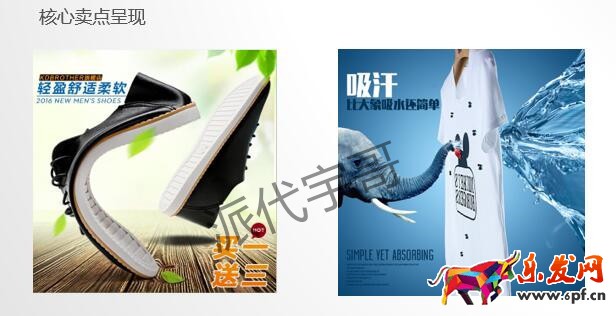 這個思路一定要去分析我們產品本身的賣點,注意不要想把我們產品賣給所有的人,千萬別犯這樣一個誤區,你的產品要鎖定最精準的人群,這樣產品本身的點擊率和轉化率都會比較高。當你想把自己產品賣給所有的人的時候,往往結果是沒有任何一個人來買你的產品。我們看第一個鞋子案例,這個鞋子車圖把軟底的這個賣店呈現的非常的完美,那如果我現在是一個想買一個軟底鞋子的買家,我就肯定回去點擊這個圖片,而且也非常容易下單購買。