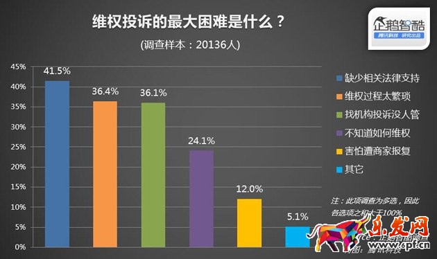 在關(guān)于維權(quán)困惑的調(diào)查中,四成網(wǎng)民選擇“缺少相關(guān)法律了解”,覺得“維權(quán)過程太繁瑣”的意見排名第二位。與之相對的是,“擔憂商家報復”占比僅為12%——網(wǎng)民對于維權(quán)還是很勇敢的!