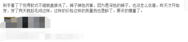 曾經操作過的一個店鋪,因為出現了一個追評差評在第一屏時候,轉化率從原來的3%的轉化率降到0.5%。這個事情告訴大家是注意店鋪里面的一些小細節。很多人的店鋪除了出現差評會主動電話去聯系客戶修改,之后并沒有針對的對于一些雖然好評可是出現不好的評價做出解釋,如圖下,雖然客戶好評了,可是評論說這個褲子掉色嚴重,大家都知道褲子最害怕的就是掉色問題,可是賣家看到這個評論不去解釋,是不是大大影響到了你這個寶貝轉化率呢。