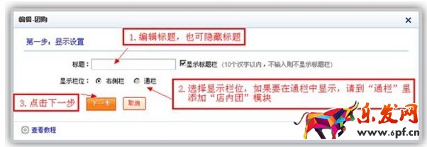 步驟二:編輯標題,也可隱藏標題,選擇顯示欄位(如果要在通欄中顯示,請到“通欄”里添加“店內團”模塊),然后再點擊下一步。