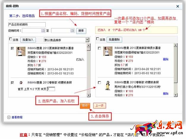 步驟三:根據產品名稱、編碼、促銷時間搜索產品(一次最多可添加12個產品,如需再添加重建一個“店內團”模塊)。