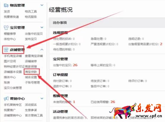 1、首先進(jìn)入淘寶賣家中心后臺,在左側(cè)菜單看管理中,找到【店鋪管理】,并點(diǎn)擊下方的“淘寶貸款”。