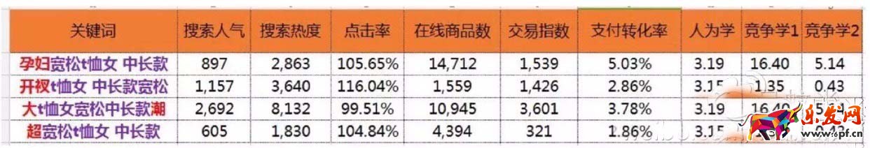 另一方面就是關(guān)鍵詞分析,這時候我們要分析的是競品關(guān)鍵詞在手淘流量搜索中訪客數(shù)、流量量、轉(zhuǎn)化率等,核心關(guān)鍵詞不同的寶貝不建議做為競品參考。以下圖數(shù)據(jù)為例,相同核心關(guān)鍵詞“寬松t恤女中長款”7天訪客數(shù)環(huán)比增長幅度7.27%,子訂單環(huán)比增長13.35%。