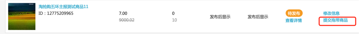 2、點擊“提交拖帶商品”或點擊“查看”后在詳情中找到“提交拖帶商品”。如下圖: