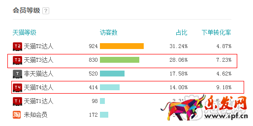 通過店鋪會員等級可看到,訪客占比及下單轉化率都基本集中在天貓T3,T4層次客戶,基本是要求高品質,高質量的高消費人群,對于產品的質量比較關心。