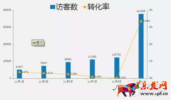 流量從1號逐漸上升到11號一柱擎天,而轉化從1號開始逐漸下降到10日跌倒冰點,11日可謂拔地而起!類目、店鋪不同可能稍有差異,但雙十一整個天貓基本是這個趨勢。