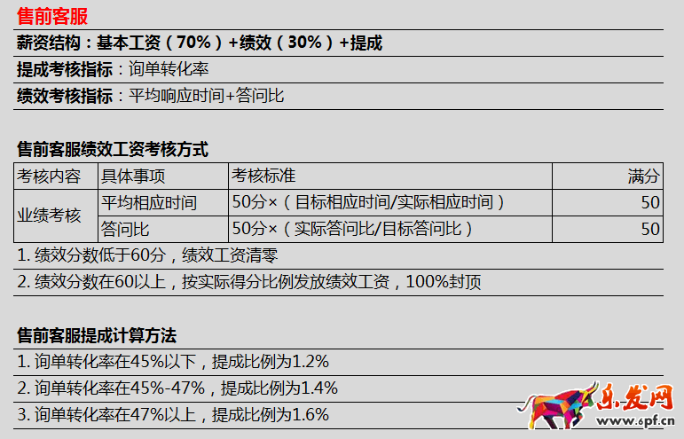 對于售前客服來說,我們知道有三項(xiàng)指標(biāo)很重要:詢單轉(zhuǎn)化率、平均響應(yīng)時(shí)間、答問比,所以,我們就可以把這三項(xiàng)指標(biāo)設(shè)計(jì)到售前客服的工資結(jié)構(gòu)里,讓每一個(gè)客服知道自己每天該干什么,如何提高自己的業(yè)務(wù)能力,并且知道如何努力工作提高自己的工資收入。