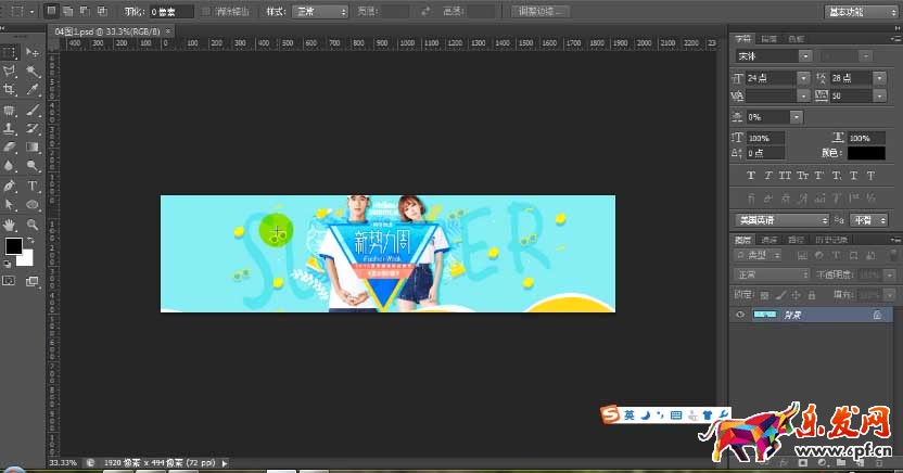 首先來看PC端的裝修技巧,要想實現全屏效果的話,首先要在PS軟件中將活動氛圍圖像制作好。以下就以新勢力周服裝素材圖像作為演示:這張圖片的大小為1920*494,我們可以利用第三節課教的950加上頁面背景的形式去實現全屏效果。當我們用多重復雜背景的時候,用第三節課講的方法在不同位置、不同背景情況下實現起來比較難。