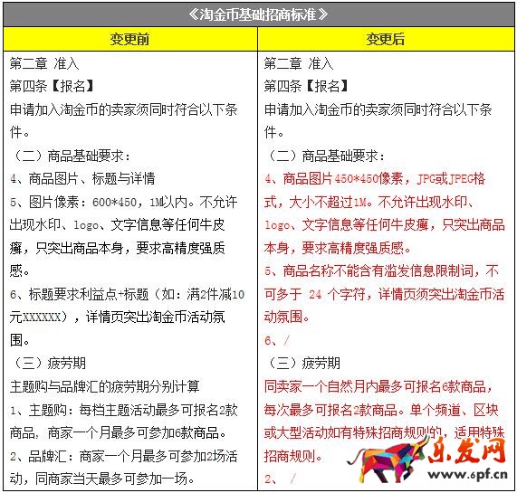 1、調整商品報名要求。具體變更要求:第四條,商品圖片450*450像素,JPG或JPEG格式,大小不超過1M。不允許出現水印、logo、文字信息等任何牛皮癬,只突出商品本身,要求高精度強質感。第五條,商品名稱不能含有濫發信息限制詞,不可多于 24 個字符,詳情頁須突出淘金幣活動氛圍。