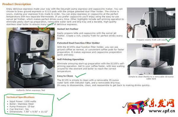 產品描述是上面功能的擴展。你的產品listing里只要出現過一次關鍵詞,產品就能出現在搜索排名結果里。下圖就是一個很好的產品描述例子,涵蓋了所有內容,甚至包括額外的規格技術信息: