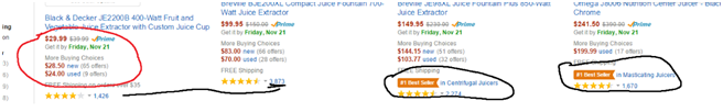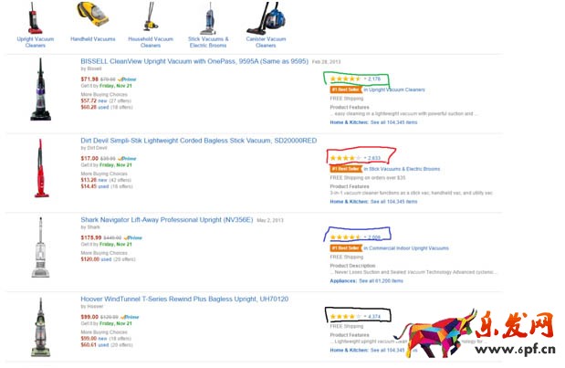很多賣家都已經知道,消費者評價的數量和積極性是A9算法里重要的排名因素之一。舉個例子,如下圖所示,排名第一的BISSEL吸塵器有最多評價,評分最高,是熱銷品,因此排在第一。第二名的Dirt Devil評價更多,評分稍低,同樣也是熱銷品,所以排在第二。而第三的Shark Navigator雖然評分比第二高,但是數量更少,一樣是熱銷品,所以排在第三。第四的Hoover WindTunnel雖然評價比前三都多,但是評分比第一、三低,而且不是熱銷品,所以排在第四: