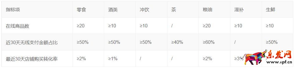 2、店鋪主營類目需屬于以下幾個一級類目之一:“零食/堅果/特產”、“酒類”、“咖啡/麥片/沖飲”、“茶”、“糧油米面/南北干貨/調味品”、“傳統滋補營養品”、“水產肉類/新鮮蔬果/熟食”。
