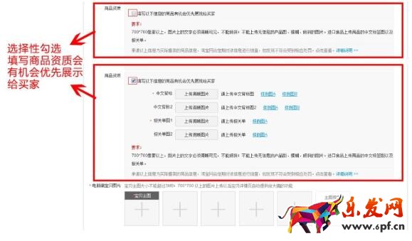 勾選商品資質,進口食品需要上傳商品的中文背標圖和報關單,請上傳至少一張中文圖和報關單圖,且中文背標圖和報關單圖與所發布寶貝相一致,如下圖: