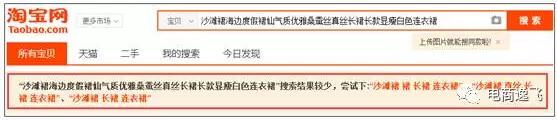 (1)標題一定要自己寫,不要抄別人的,不要用供貨商直接給的數據包。標題一定要根據自己店鋪的實際情況去寫,確定最適合店鋪基礎的主詞,然后用生意參謀去選詞,店鋪基礎好,就可以用大詞,店鋪基礎不好就用二級詞作為主詞,比如你是一個新店,在生意參謀選詞的時候,就不要用連衣裙這么大的詞,你可以用“連衣裙長袖”作為主詞去選擇長尾詞。你寫好標題以后,在淘寶搜索框全標題搜索一下,看一下是否會出現這個: